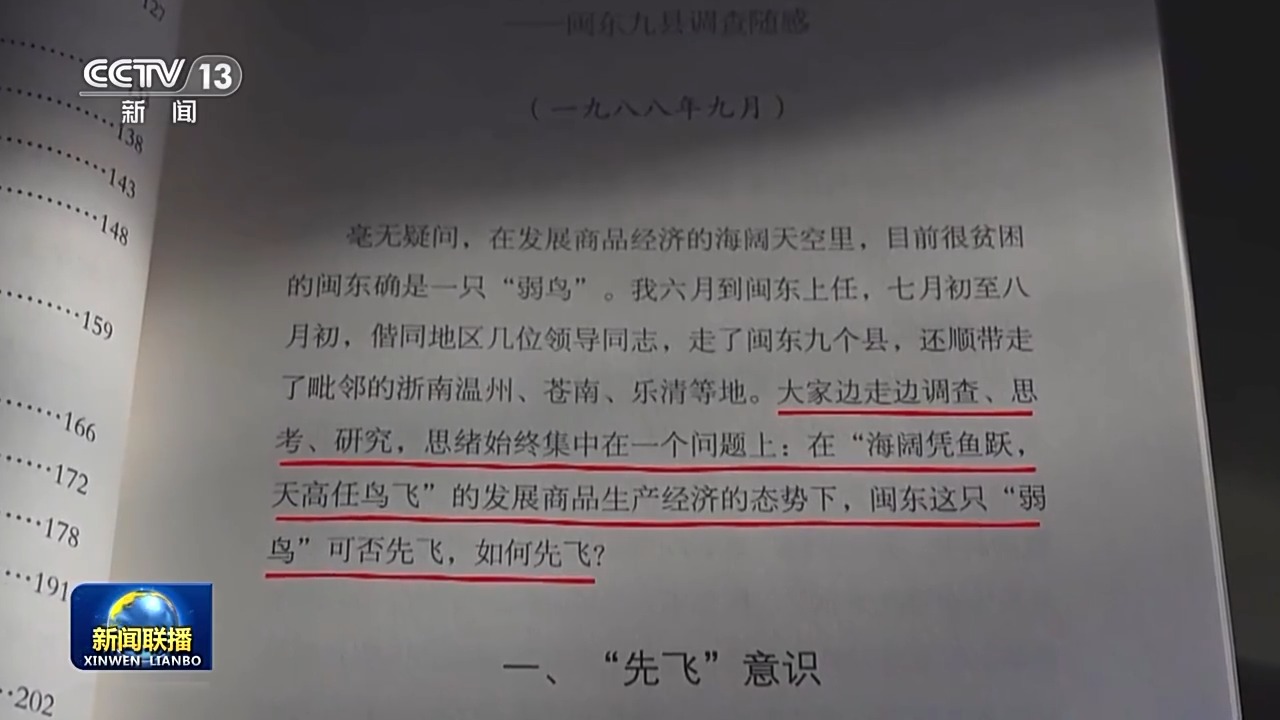 在一個多月里,習(xí)近平去了古田、屏南等9個縣的13個鄉(xiāng)鎮(zhèn)、18個村。隨后,他在《弱鳥如何先飛》這篇文章里寫道:大家邊走邊調(diào)查、思考、研究,思緒始終集中在一個問題上,在“海闊憑魚躍,天高任鳥飛”的發(fā)展商品生產(chǎn)經(jīng)濟的態(tài)勢下,閩東這只“弱鳥”可否先飛,如何先飛?