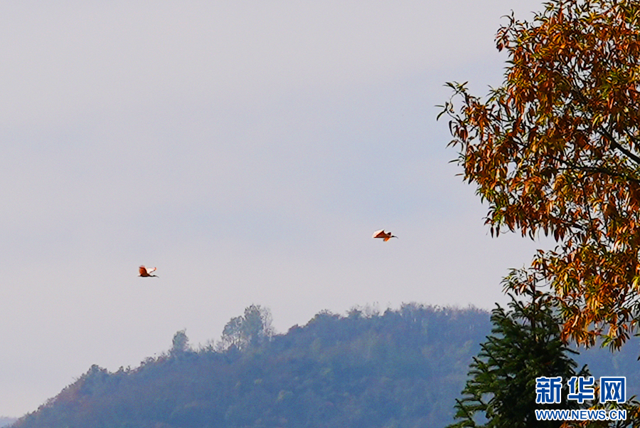 冬日,在石泉縣城關(guān)鎮(zhèn)絲銀壩村草池灣,2只朱鹮自由翱翔。新華網(wǎng) 楊喜龍 攝