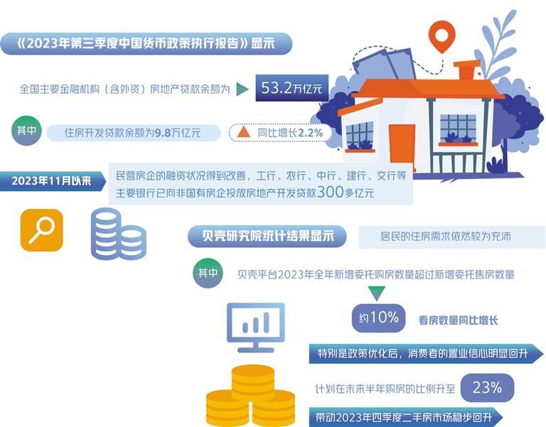 從銀行信貸角度看,房地產(chǎn)信貸融資的規(guī)模、結(jié)構(gòu)整體穩(wěn)定。《2023年第三季度中國貨幣政策執(zhí)行報告》顯示,全國主要金融機構(gòu)(含外資)房地產(chǎn)貸款余額為53.2萬億元,其中,住房開發(fā)貸款余額為9.8萬億元,同比增長2.2%。2023年11月以來,民營房企的融資狀況得到改善,工行、農(nóng)行、中行、建行、交行等主要銀行已向非國有房企投放房地產(chǎn)開發(fā)貸款300多億元。