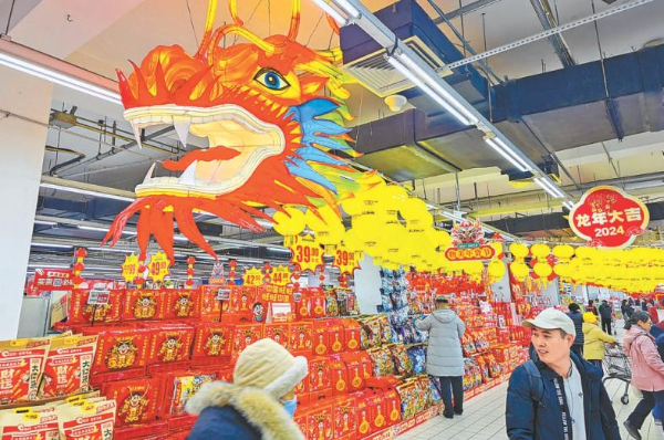 北京各大商超節(jié)日氛圍漸濃,在物美超市玉蜓橋店,新春節(jié)慶商品擺滿貨架,喜慶紅火的龍形掛飾裝點(diǎn)賣場(chǎng)。 記者 鄧偉攝