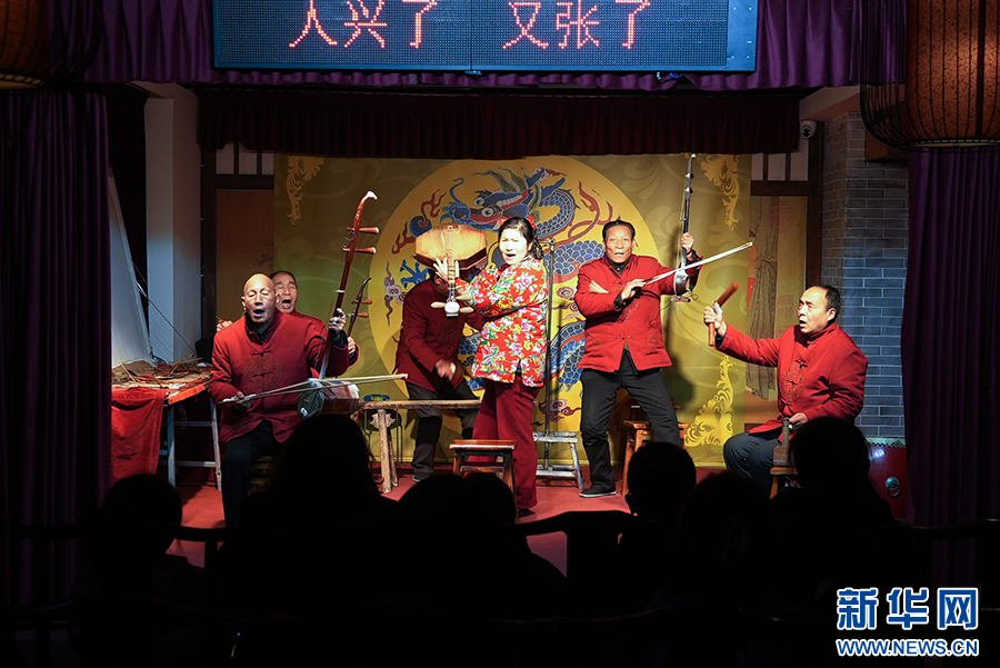 在西安永興坊——陜西非遺文化特色街區(qū),今年69歲的楊啟民(右二)和“華陰市衛(wèi)峪老腔藝術(shù)團”的其他老藝人表演國家級非遺華陰老腔《關(guān)中古歌》。新華網(wǎng) 楊喜龍 攝