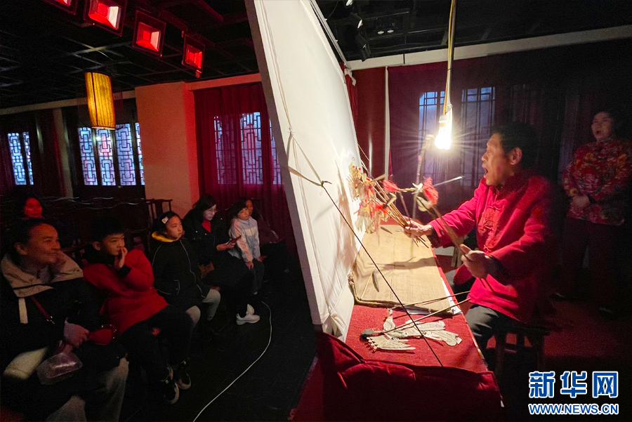 在西安永興坊——陜西非遺文化特色街區(qū),今年56歲的王春桃,為小朋友們表演國家級非遺合陽提線木偶戲《賣雜貨》。 新華網(wǎng) 楊喜龍 攝
