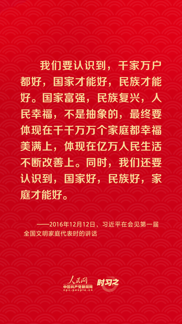 團(tuán)圓是春節(jié)永恒的主題。“沒(méi)有國(guó)家繁榮發(fā)展,就沒(méi)有家庭幸福美滿。同樣,沒(méi)有千千萬(wàn)萬(wàn)家庭幸福美滿,就沒(méi)有國(guó)家繁榮發(fā)展。”習(xí)近平總書(shū)記曾在多個(gè)場(chǎng)合深刻闡述家庭與國(guó)家之間的關(guān)系,從他的話語(yǔ)里一起感悟深厚的家國(guó)情懷。