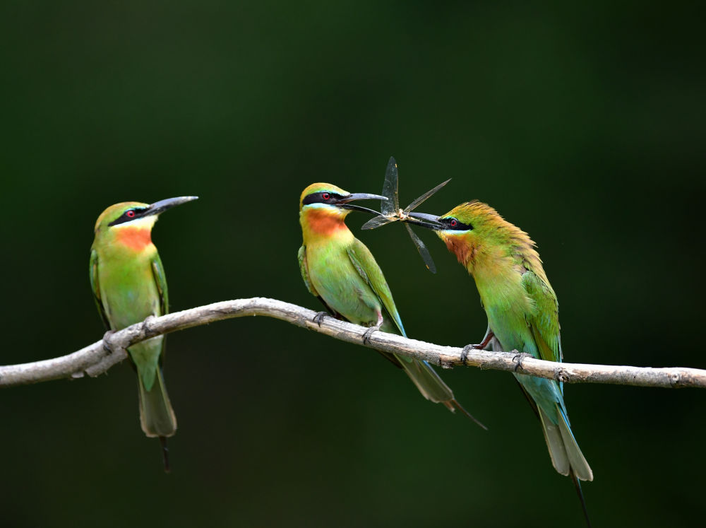 在廈門五緣灣栗喉蜂虎自然保護(hù)區(qū)騎馬山片區(qū),一只栗喉蜂虎雄鳥(niǎo)(右)給兩只雌鳥(niǎo)喂食昆蟲(chóng)(2023年5月20日攝)。新華社記者 魏培全 攝