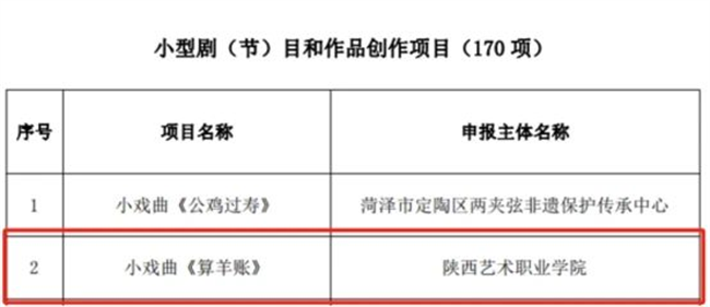 西部決策網(wǎng)訊(記者劉玉 韓宗憲 通訊員 吳卉)近日,國家藝術(shù)基金管理中心公布了《國家藝術(shù)基金(一般項目)2024年度資助項目公示名單》,陜西藝術(shù)職業(yè)學(xué)院教師彭馨韻申報的小戲曲《算羊賬》獲批舞臺藝術(shù)創(chuàng)作資助項目(小型劇(節(jié))目和作品創(chuàng)作項目)。