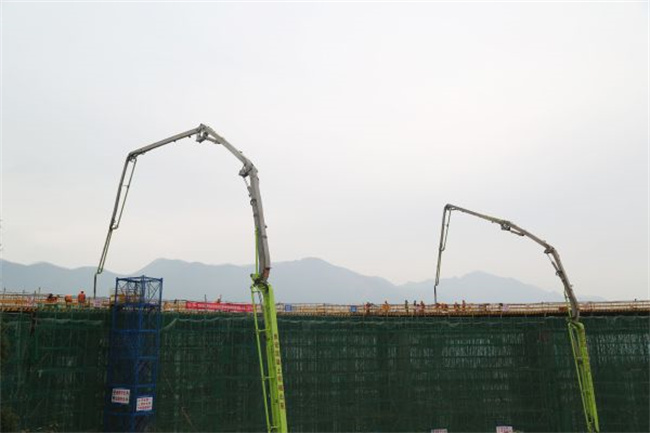 長(zhǎng)慶互通B匝道橋上部結(jié)構(gòu)為鋼筋混凝土連續(xù)箱梁,長(zhǎng)約100米,混凝土體積705立方米,采用盤(pán)扣式滿堂支架現(xiàn)澆法施工。為保障混凝土澆筑安全和質(zhì)量,項(xiàng)目部主要管理人員現(xiàn)場(chǎng)帶班,旁站監(jiān)理工程師現(xiàn)場(chǎng)履職,并配置46米混凝土泵車(chē)2臺(tái),混凝土攪拌運(yùn)輸車(chē)8臺(tái)。